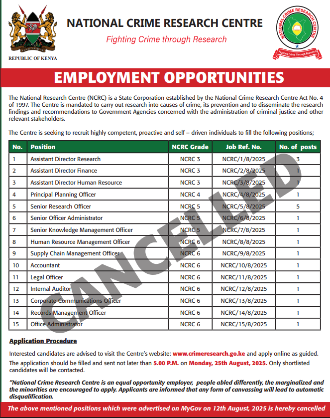 The National Research Centre (NCRC) is a State Corporation established by the National Crime Research Centre Act No. 4 of 1997. The Centre is mandated to carry out research into causes of crime, its prevention, and to disseminate the research findings and recommendations to Government Agencies concerned with the administration of criminal justice and other relevant stakeholders.